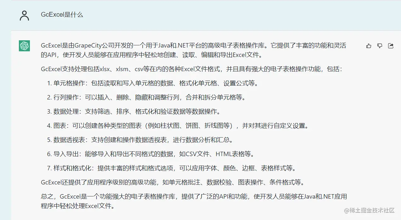 除了使用Apache POI库,还发现了一款商业软件GcExcel,由于不太不了解这个东西,所以简单的ChatGpt了一下GcExcel,