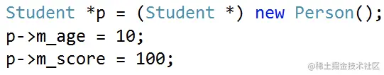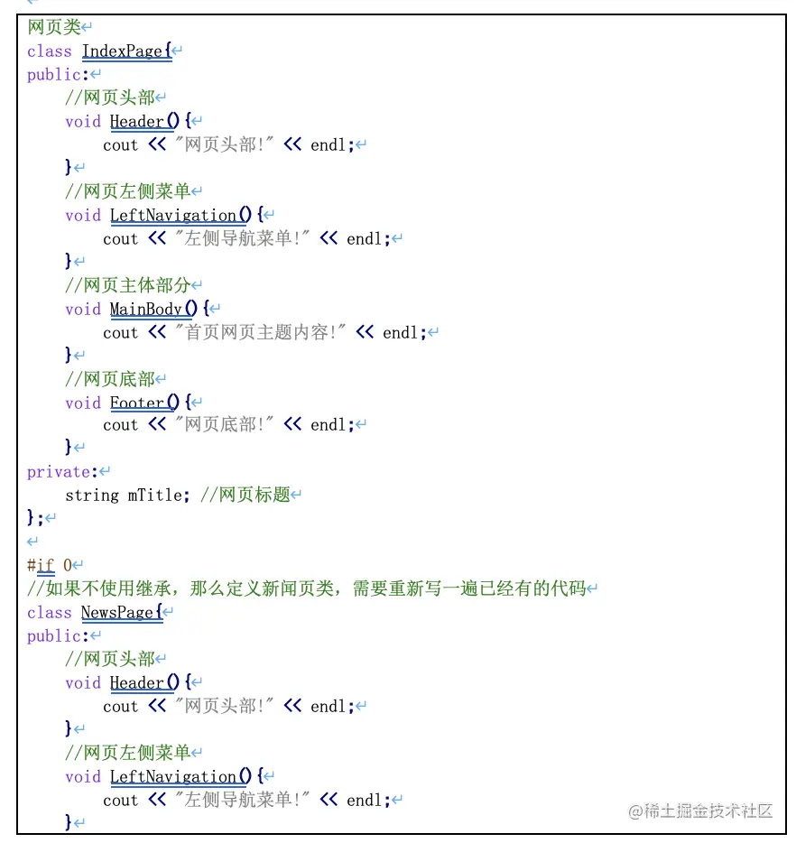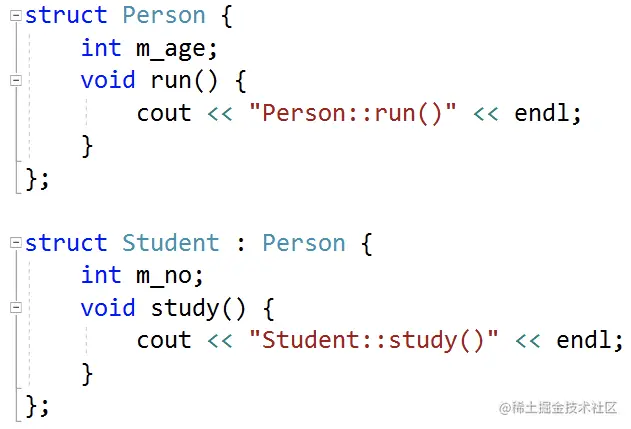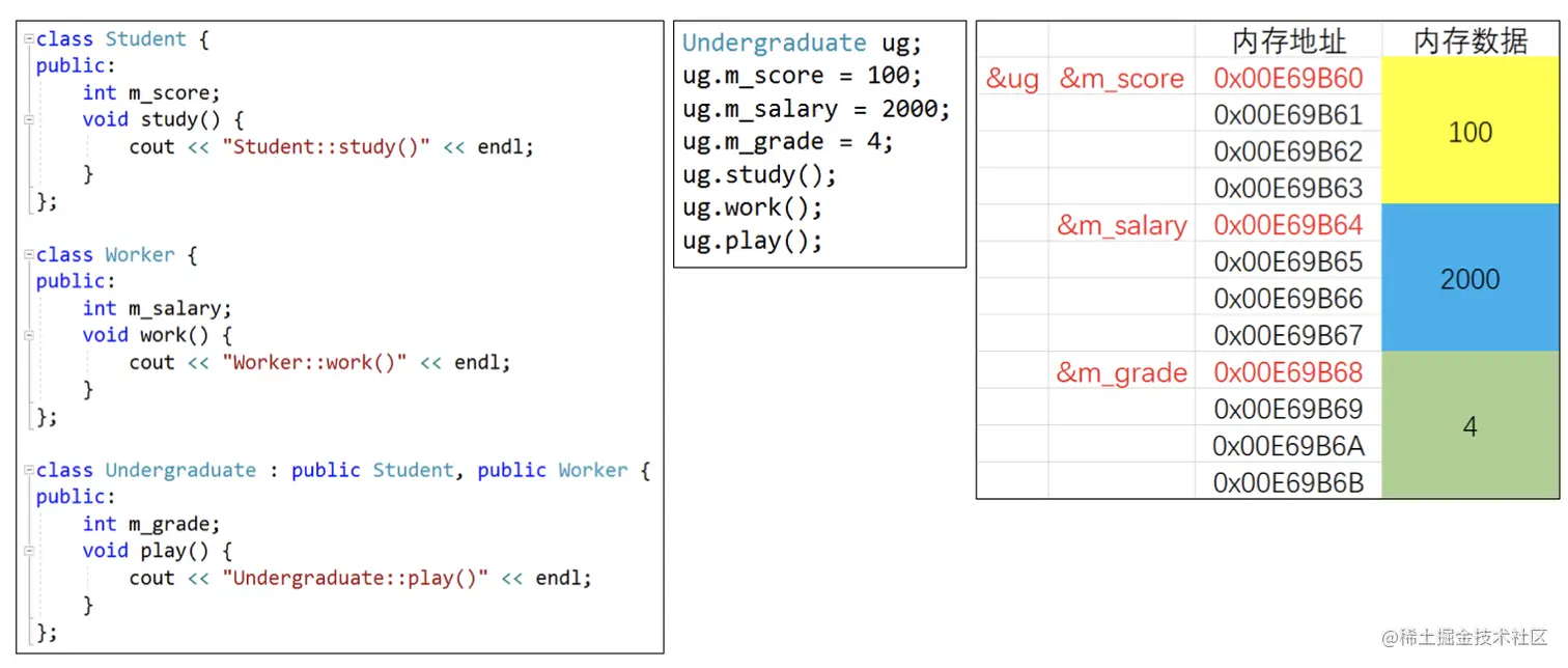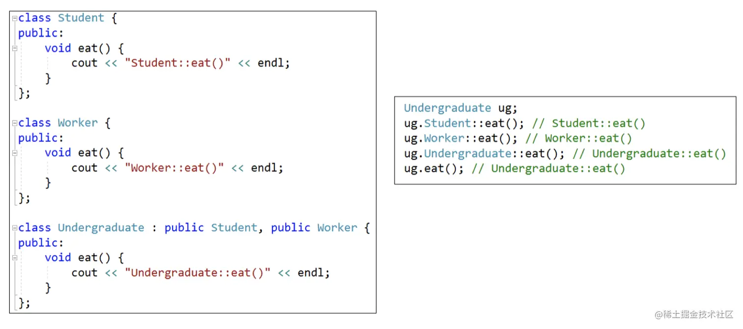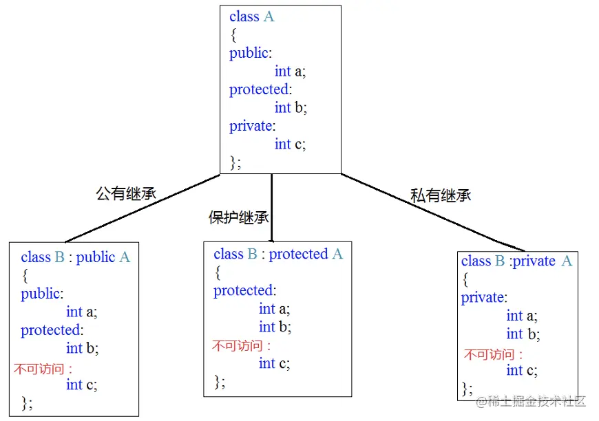 //基类 class A{ public: int mA; protected: int mB; private: int mC; }; // 公有(public)继承 class B : public A{ public: void PrintB(){ cout<< mA << endl; //可访问基类public属性 cout<< mB << endl; //可访问基类protected属性 //cout << mC <<endl; //不可访问基类private属性 } }; class SubB : public B{ void PrintSubB(){ cout<< mA << endl; //可访问基类public属性 cout<< mB << endl; //可访问基类protected属性 //cout << mC <<endl; //不可访问基类private属性 } }; void test01(){ B b; cout<< b.mA << endl; //可访问基类public属性 //cout << b.mB <<endl; //不可访问基类protected属性 //cout << b.mC <<endl; //不可访问基类private属性 } //2. 私有(private)继承 class C : private A{ public: void PrintC(){ cout<< mA << endl; //可访问基类public属性 cout<< mB << endl; //可访问基类protected属性 //cout << mC <<endl; //不可访问基类private属性 } }; class SubC : public C{ void PrintSubC(){ //cout << mA <<endl; //不可访问基类public属性 //cout << mB <<endl; //不可访问基类protected属性 //cout << mC <<endl; //不可访问基类private属性 } }; void test02(){ Cc; //cout << c.mA <<endl; //不可访问基类public属性 //cout << c.mB <<endl; //不可访问基类protected属性 //cout << c.mC <<endl; //不可访问基类private属性 } //3. 保护(protected)继承 class D : protected A{ public: void PrintD(){ cout<< mA << endl; //可访问基类public属性 cout<< mB << endl; //可访问基类protected属性 //cout << mC <<endl; //不可访问基类private属性 } }; class SubD : public D{ void PrintD(){ cout<< mA << endl; //可访问基类public属性 cout<< mB << endl; //可访问基类protected属性 //cout << mC <<endl; //不可访问基类private属性 } }; void test03(){ Dd; //cout << d.mA <<endl; //不可访问基类public属性 //cout << d.mB <<endl; //不可访问基类protected属性 //cout << d.mC <<endl; //不可访问基类private属性 }