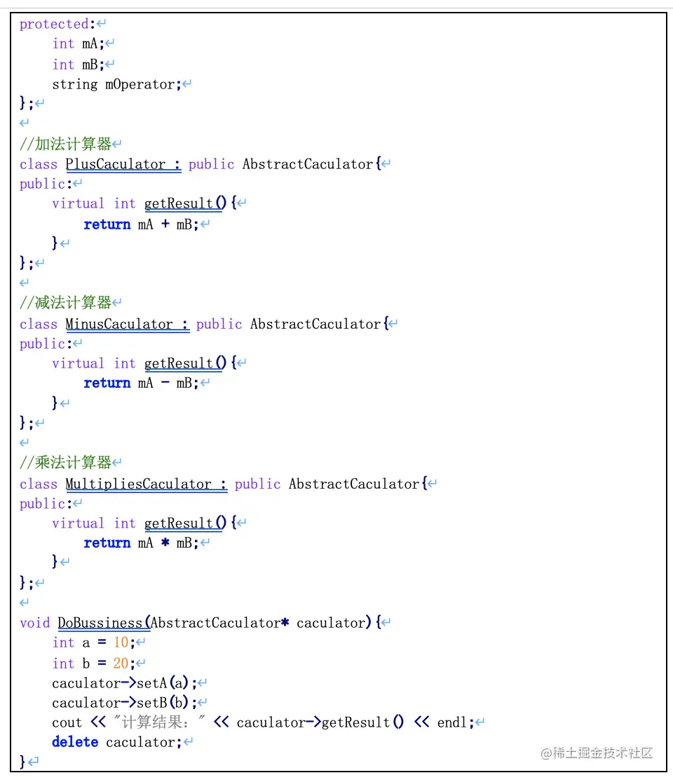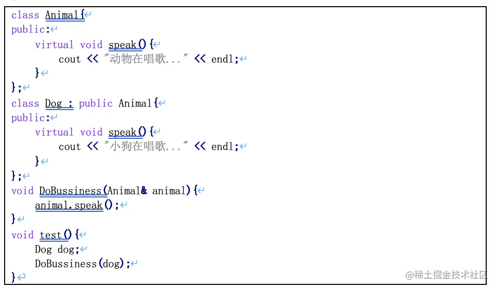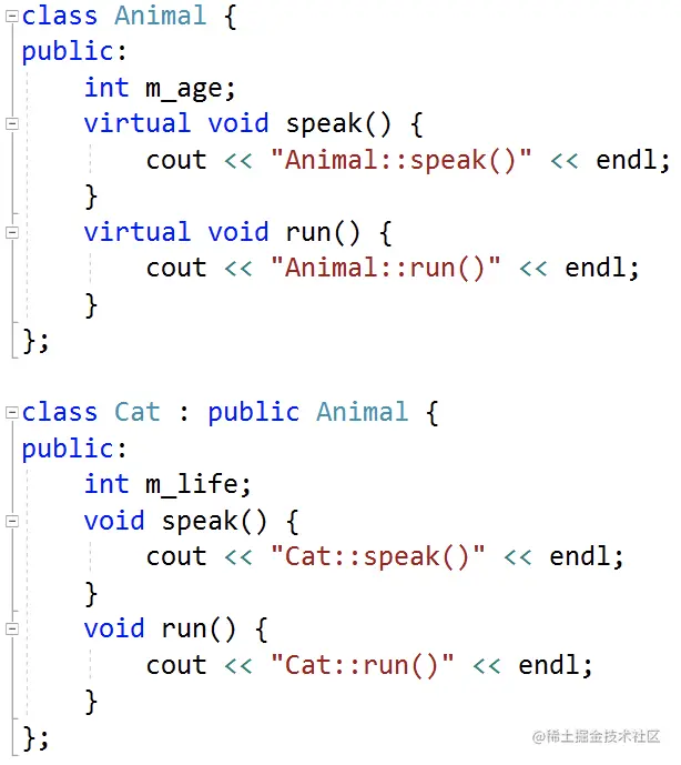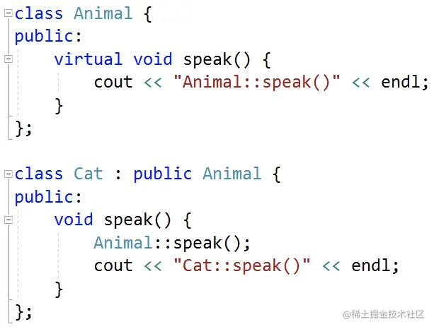 class Base{ public: Base():mParam(0){} void Print(){ cout << mParam << endl; } public: int mParam; }; class Derived : public Base{ public: Derived():mParam(10){} void Print(){ //在派生类中使用和基类的同名成员,显示使用类名限定符 cout<< Base::mParam << endl; cout<< mParam << endl; } //返回基类重名成员 int& getBaseParam(){ return Base::mParam; } public: int mParam; }; int main(){ Derived derived; //派生类和基类成员属性重名,子类访问成员默认是子类成员 cout<< derived.mParam << endl; //10 derived.Print(); //类外如何获得基类重名成员属性 derived.getBaseParam() = 100; cout<< "Base:mParam:" << derived.getBaseParam() << endl; return EXIT_SUCCESS; }