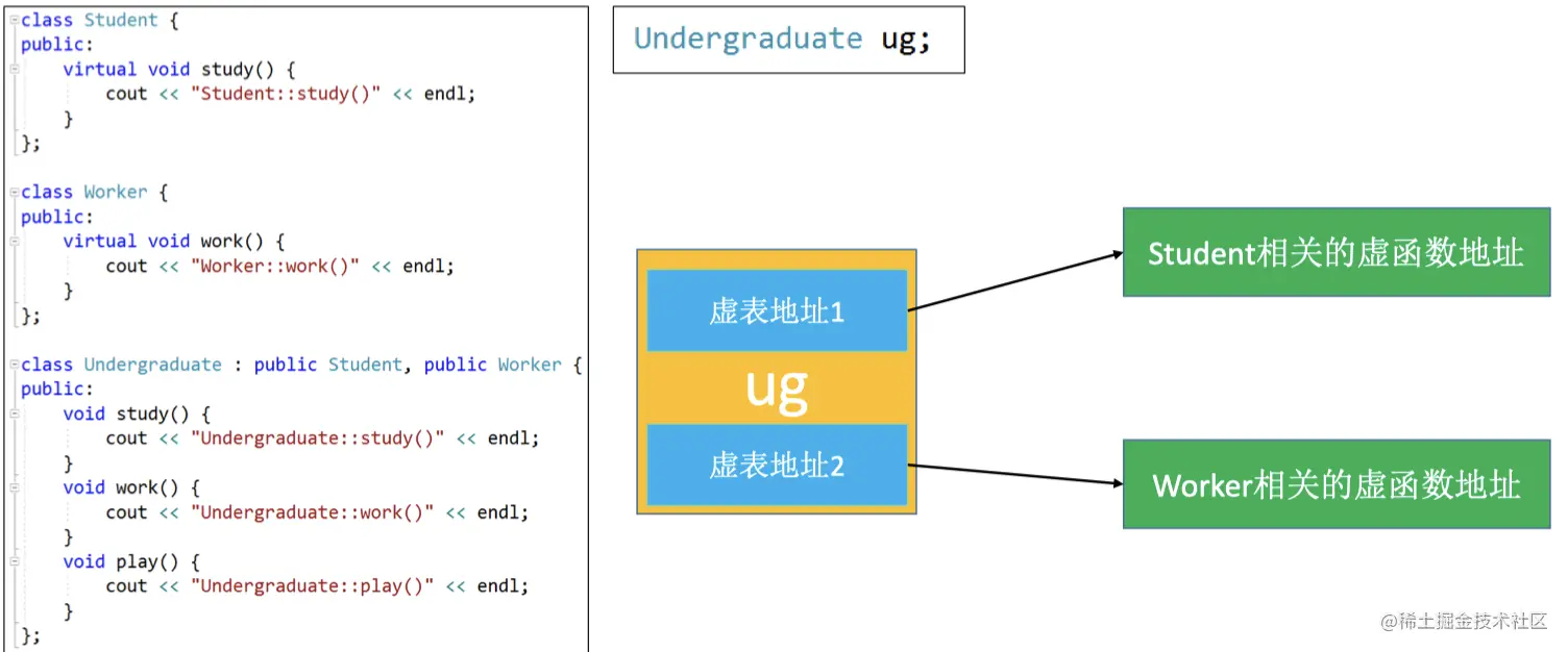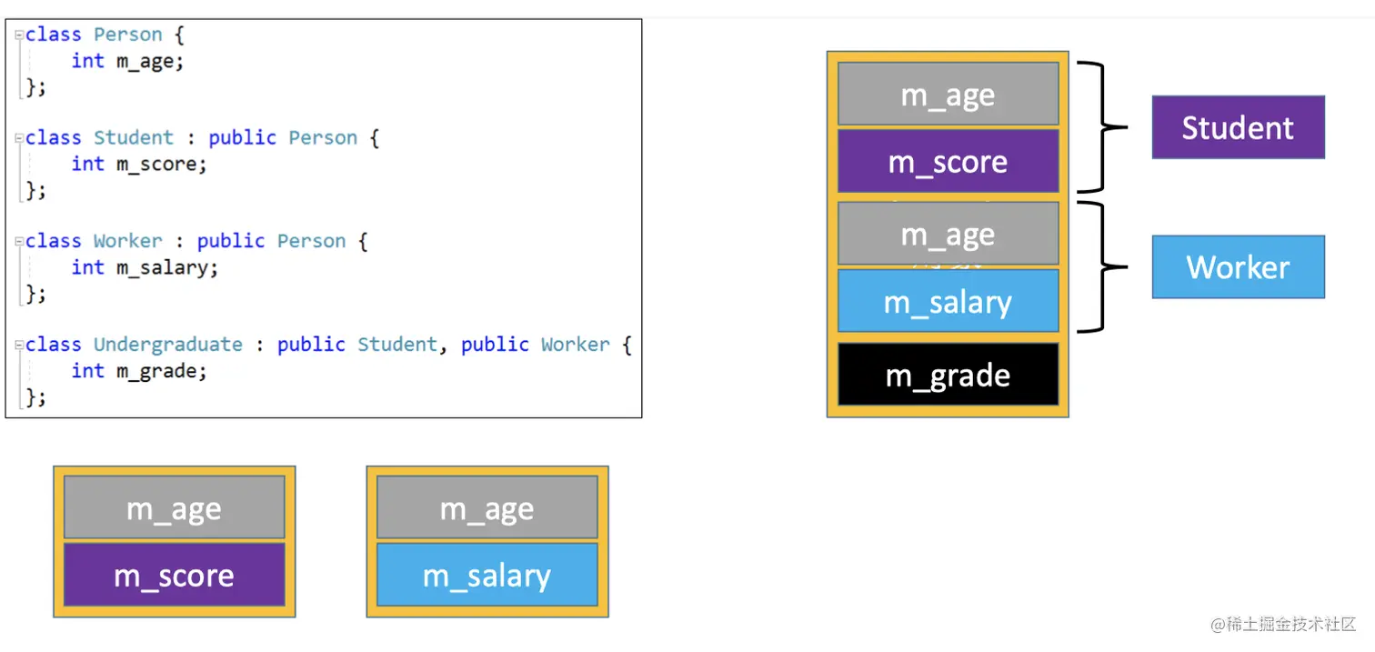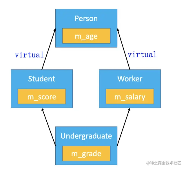 - 对于这种菱形继承所带来的两个问题,c++为我们提供了一种方式,采用虚基类。那么我们采用虚基类方式将代码修改如下