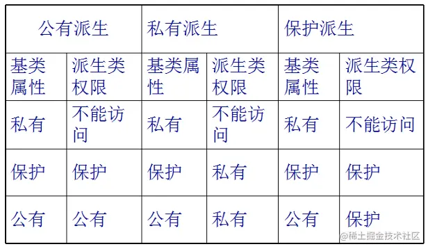 - 派生类的访问权限规则如下: