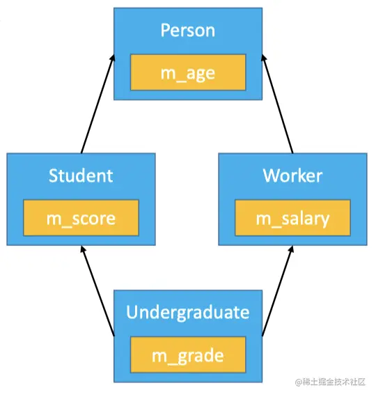- 两个派生类继承同一个基类而又有某个类同时继承者两个派生类,这种继承被称为菱形继承,或者钻石型继承