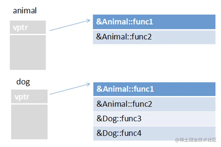 在C++编译器的内部可以理解为结构体,子类是由父类成员叠加子类新成员而成: