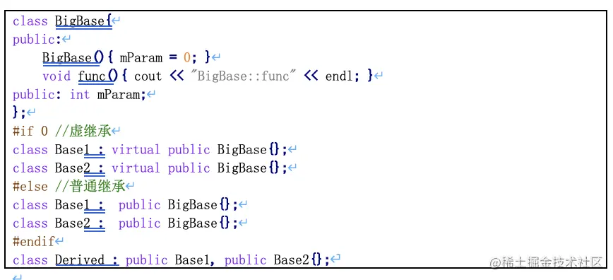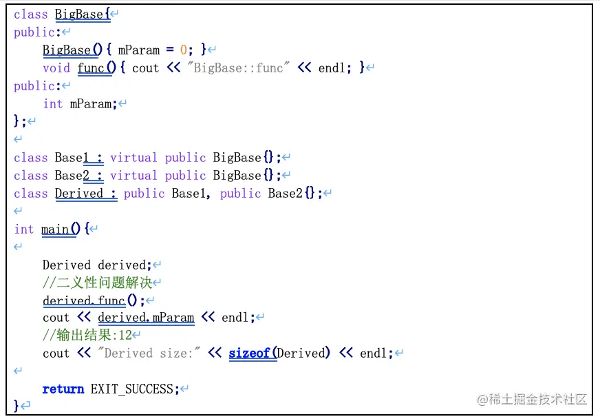 - 以上程序Base1 ,Base2采用虚继承方式继承BigBase,那么BigBase被称为虚基类。