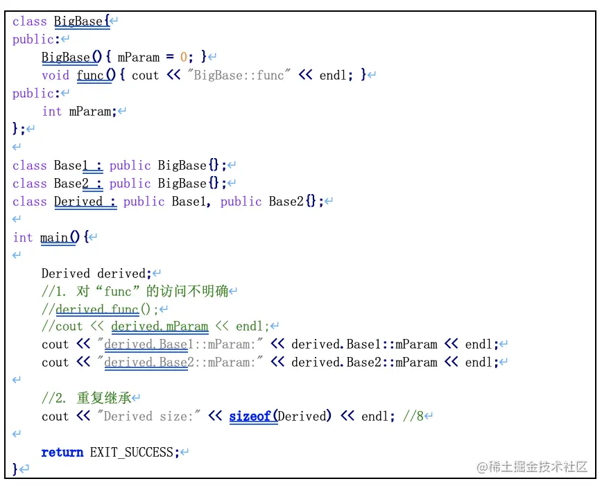 class Base1{ public: void func1(){ cout << "Base1::func1" << endl; } }; class Base2{ public: void func1(){ cout << "Base2::func1" << endl; } void func2(){ cout << "Base2::func2" << endl; } }; //派生类继承Base1、Base2 class Derived : public Base1, public Base2{}; int main(){ Derived derived; //func1是从Base1继承来的还是从Base2继承来的? //derived.func1(); derived.func2(); //解决歧义:显示指定调用那个基类的func1 derived.Base1::func1(); derived.Base2::func1(); return EXIT_SUCCESS; } - 多继承会带来一些二义性的问题, 如果两个基类中有同名的函数或者变量,那么通过派生类对象去访问这个函数或变量时就不能明确到底调用从基类1继承的版本还是从基类2继承的版本?