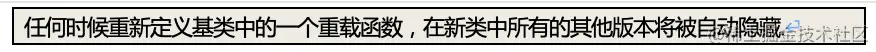 - 如果重新定义一个静态成员函数,所有在基类中的其他重载函数会被隐藏
