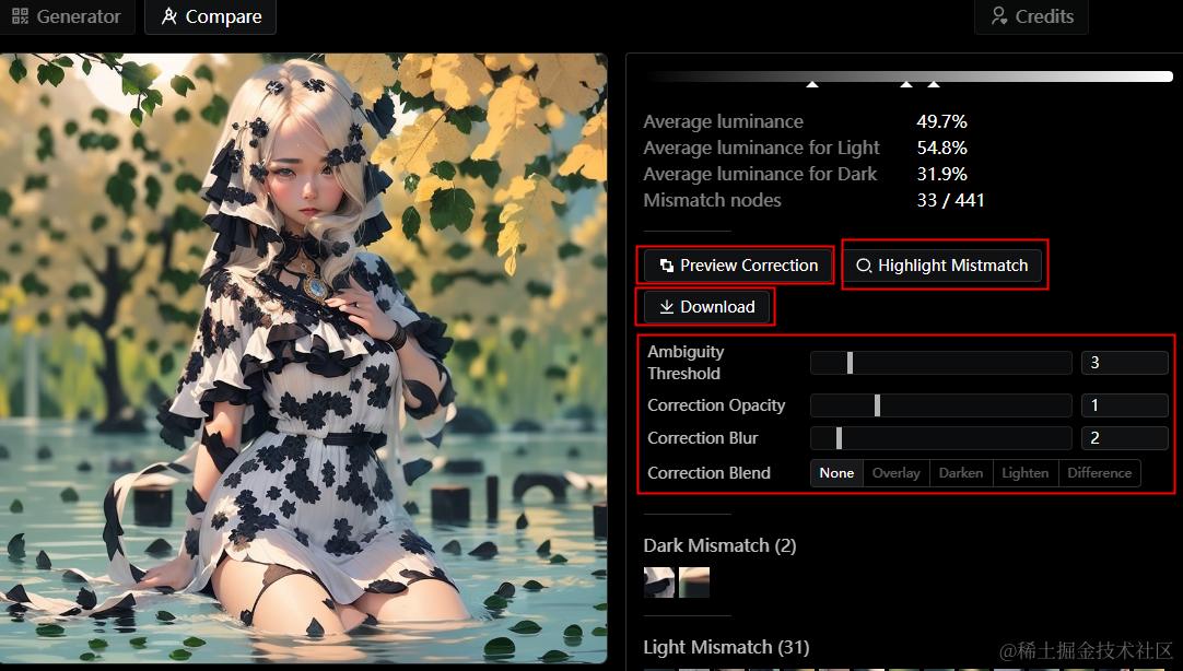 在它的选项卡Compare这里可以上传生成的图片和二维码图片,它会对比两张图,找出错误的像素点,点击右侧的 “Preview Correction”可以预览修复效果,点击“Download”可以下载修复后的图,下边还有一些修复参数,可以点击看看效果,这里就不啰嗦了。