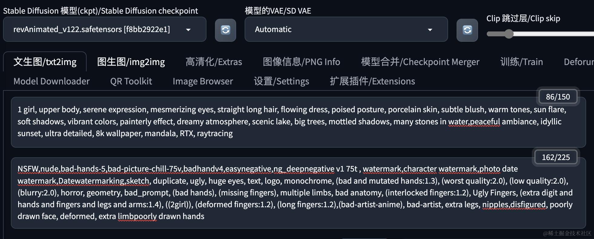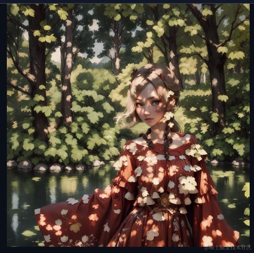 正向提示词:1 girl, upper body, serene expression, mesmerizing eyes, straight long hair, flowing dress, poised posture, porcelain skin, subtle blush, warm tones, sun flare, soft shadows, vibrant colors, painterly effect, dreamy atmosphere, scenic lake, big trees, mottled shadows, many stones in water,peaceful ambiance, idyllic sunset, ultra detailed, 8k wallpaper, mandala, RTX, raytracing