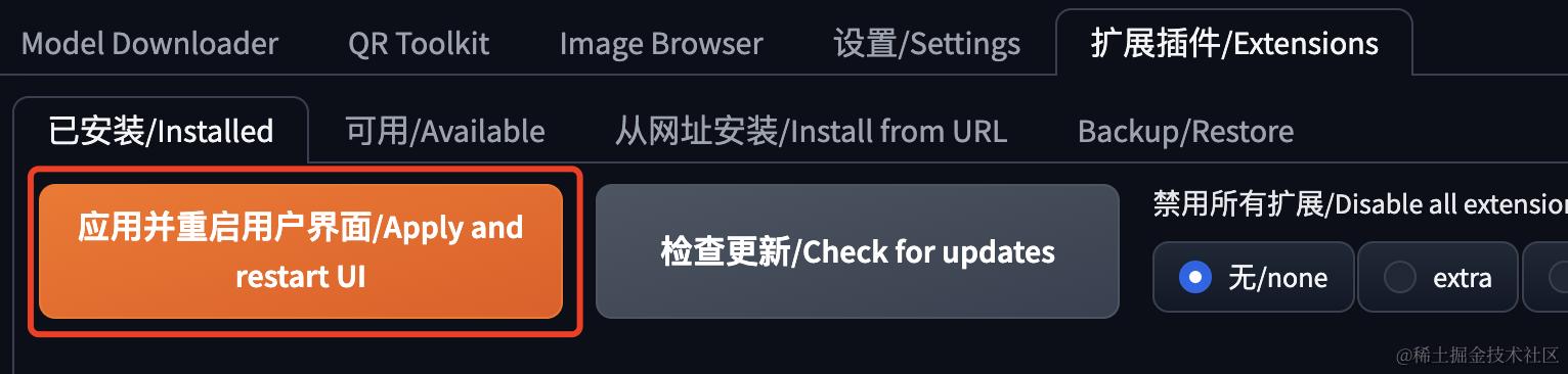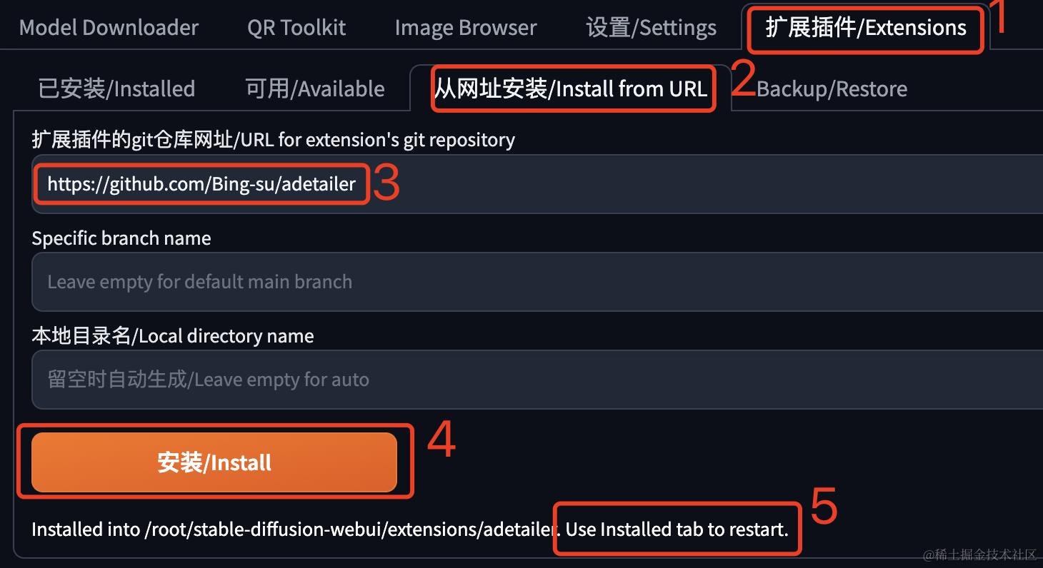 (1)安装这个细节处理插件:github.com/Bing-su/ade…,注意安装完成后需要重启。