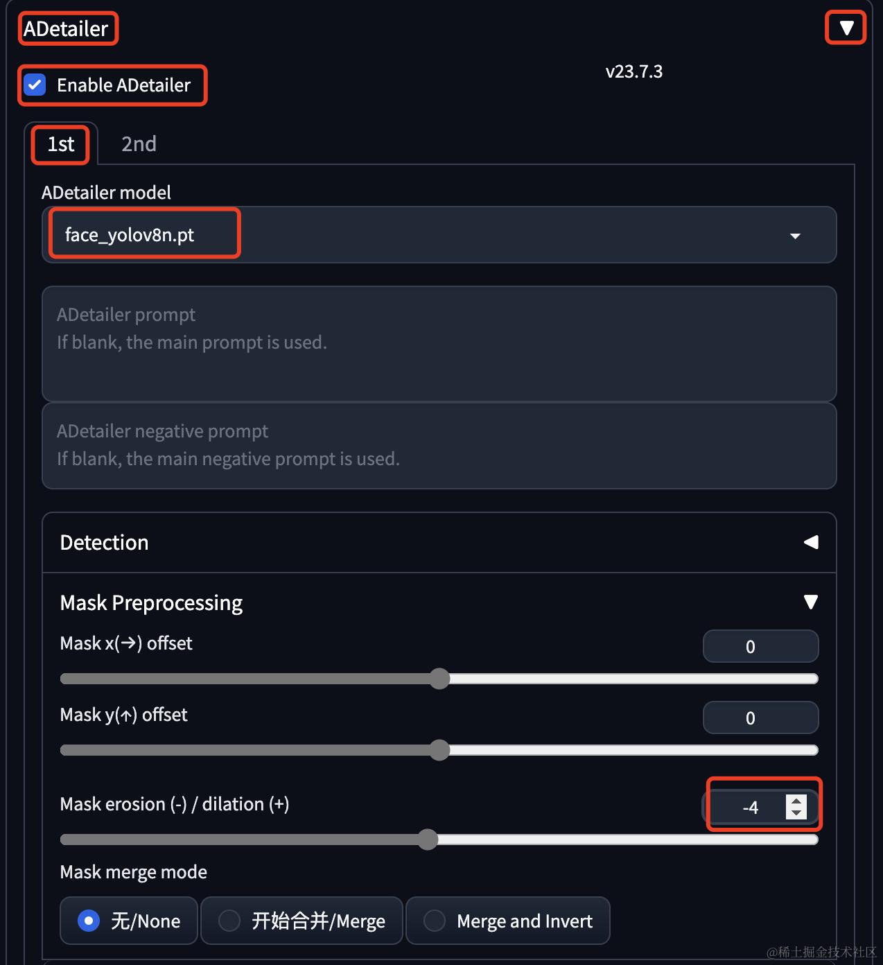 (3)重启后,在图像生成种子的下边会看到多了一个ADetailer的区块,选择我们刚刚下载的这个模型,最先变有个参数 Mask erosion 设置为-4,是为了让脸部不要太影响二维码。