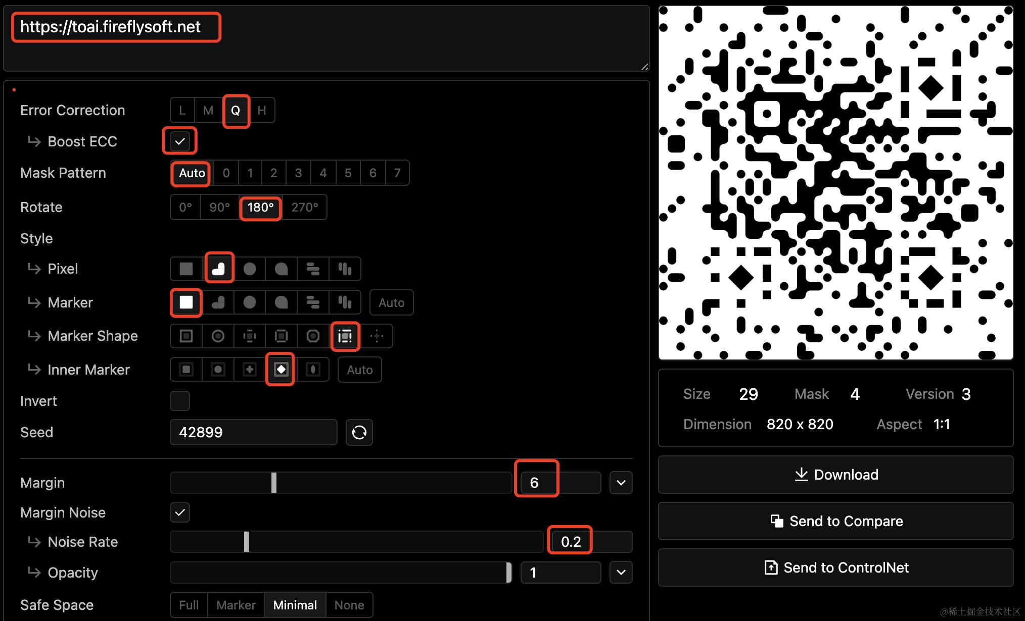 这里 Control Weight 参数也很重要,如果二维码的痕迹比较重,则需要降低这个权重,如果扫不出来,则需要增加这个权重。大家需要根据自己的二维码和要生成的图片效果进行设置,没有放之四海皆可的标准值。