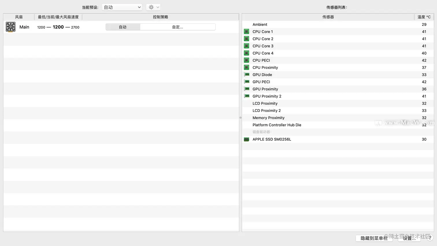 因此,推荐 MacBook 用户使用 Macs Fan Control Pro 这个 app,它可以帮你手动调整风扇转速。安装后就可以在菜单栏看到电脑目前的温度和转速。