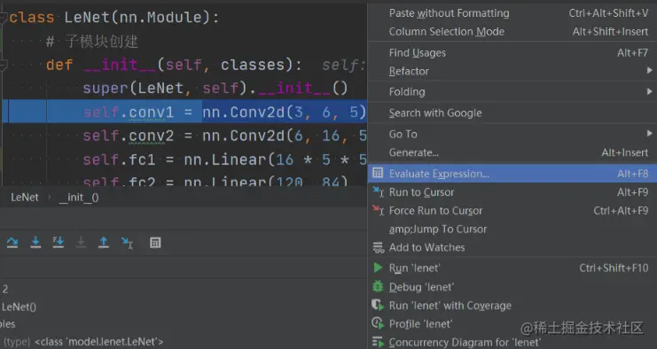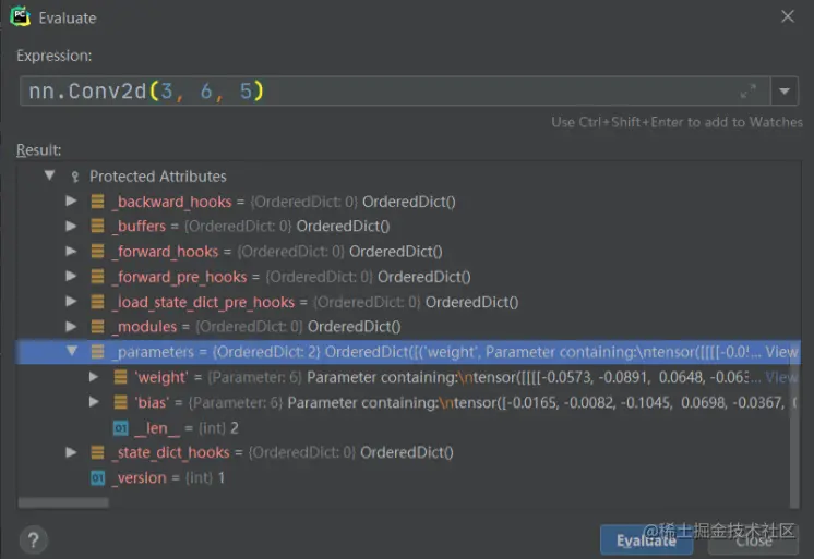 下面看下每个子模块是如何添加到 LeNet 的_modules 属性中的。以self.conv1 = nn.Conv2d(3, 6, 5)为例,当我们运行到这一行时,首先 Step Into 进入 Conv2d的构造,然后 Step Out。右键Evaluate Expression查看nn.Conv2d(3, 6, 5)的属性。