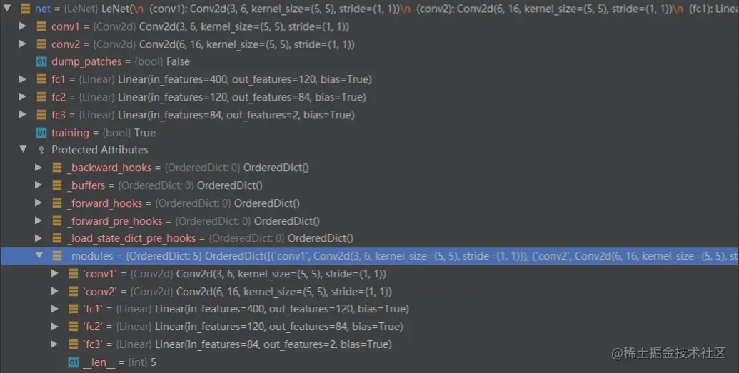 当调用net = LeNet(classes=2)创建模型后,net对象的 modules 属性就包含了这 5 个子网络模块。