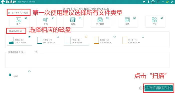 (1)下载软件后先点击 【免费试用】 ,再对需要扫描的数据进行选择,如果是第一次使用该软件,建议你勾选全部的文件类型,然后选择需要扫描的磁盘,并点击 【扫描】;