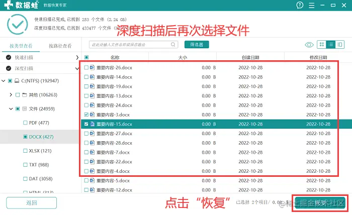 (3)如果发现扫描后没有部分文件有缺失,可以点击 【深度扫描】 并进行等待,以获得更全面的扫描结果,再次对文件进行选择后点击 【恢复】 。
