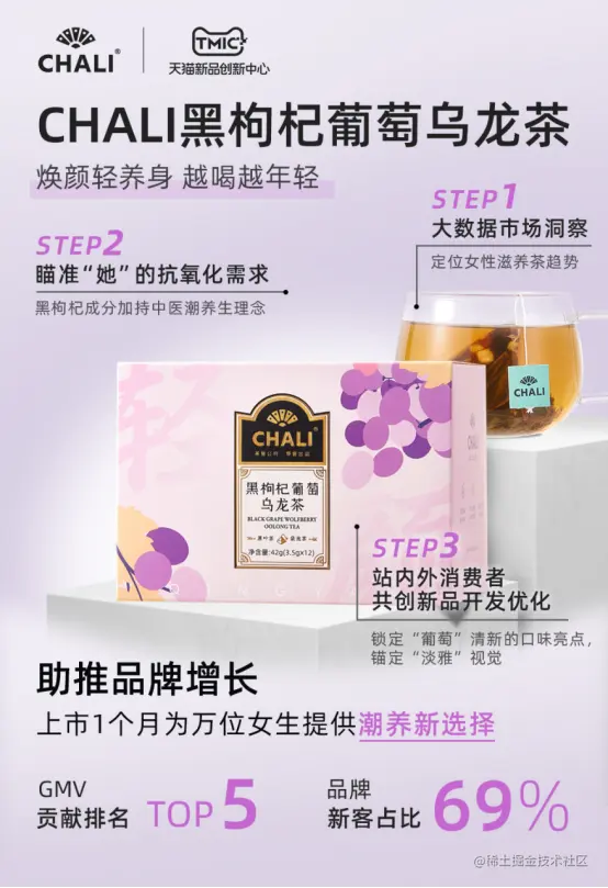 举个例子,CHALI今年上市“潮养”系列袋泡茶,就是通过TMIC大数据时长洞察定位女性滋养茶趋势,瞄准了现代女性抗氧化的需求,结合黑枸杞成分以及中医潮养生的理念推出。