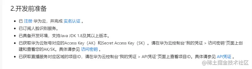 第二步告诉了我们需要准备哪些前提,比如需要注册华为云、实名认证、订阅人脸识别服务、以及一些开发环境等等…本章节上面还标注了对应的链接,点击直接跳转,还是很方便的,并且每一步都有详细的说明跟着说明一步一步操作就OK了