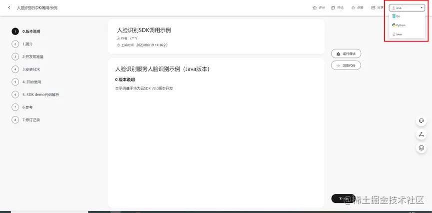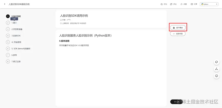 然后就是非常值得一提的了~华为云提供的人脸识别的SDK,平台还提供了在线调试!这个简直太方便了!有时候外出,去客户场地,不方便携带电脑的情况下可以说是有如神助!!!