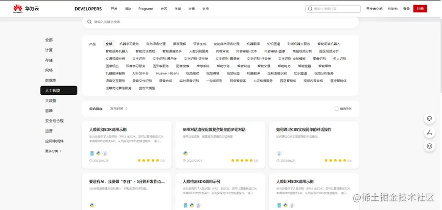 界面有很清晰的导航栏,把所有示例进行了分类,包括计算、存储、网络、数据库、人工智能、大数据、容器、安全与合规、运营、应用中间件、管理与监管、CDN与智能边缘、软件开发生产线、企业应用、迁移、区块链、视频、IoT物联网、专属云、企业网络、开天aPaaS、工业软件、开发者工具、支持与服务、ApiHub共计25个大分类,每个分类中还有详细分类,可以根据自身需求筛选到所需示例。同时可以通过搜索栏直接搜索关键字查询所需示例。