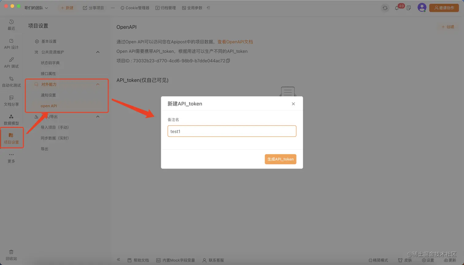 - 在Apipost 「项目设置」>「对外能力」>「open API」中创建、复制 API-token、项目ID。