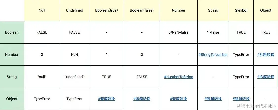 其它运算,如加减乘除大于小于,也都会涉及类型转换。幸好的是,实际上大部分类型转换规则是非常简单的,如下表所示: