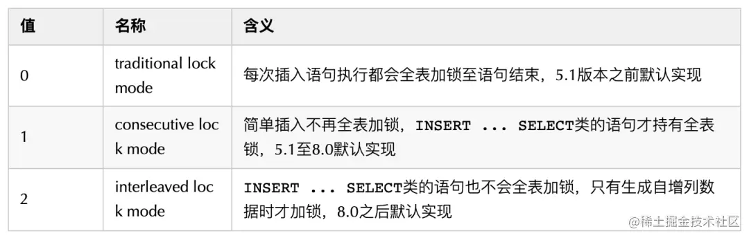 MySql5.1之前的这种实现方式可以保证AUTO_INCREMENT严格自增,但是并发程度也最差,因为AUTO_INCREMENT锁是全表加锁直到这条语句结束