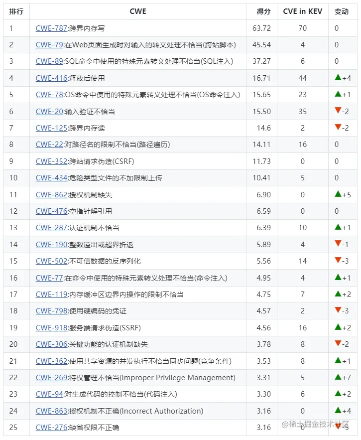 CWE 通过分析2021到2022年报告的43,996个CVE漏洞,得到了2023 最具威胁的25种漏洞。