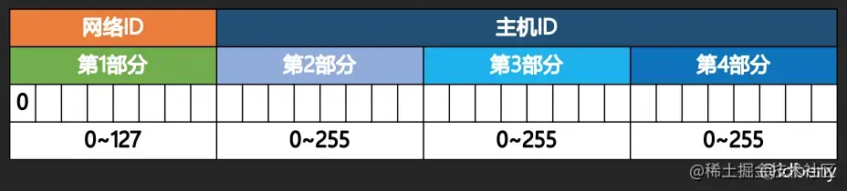 IP地址由2部分组成:网络标识(网络ID)、主机标识(主机ID) 同一网段的计算机,网络ID相同
