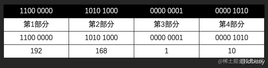 1100 0000.1010 1000.0000 0001.0000 1010 -> 192.168.1.10(10进制)
