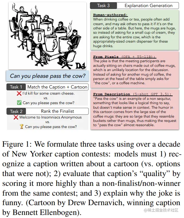 论文简介:大型神经网络现在可以生成笑话,但它们真的「理解」幽默吗?该研究用源自 New Yorker Cartoon Caption Contest 的三项任务来测试人工智能模型,包括将笑话与卡通相匹配、选出优质配文(caption)以及解释优质配文为何有趣。完成这些任务的关键是「理解」图像和配文之间复杂且出人意料的关系,幽默经常涉及对人类经验和文化的间接、有趣的暗示。该论文研究了多模态模型和纯语言模型:前者直接接受卡通图像的挑战;后者则给出视觉场景的多方面描述以模拟人类水平的视觉理解。