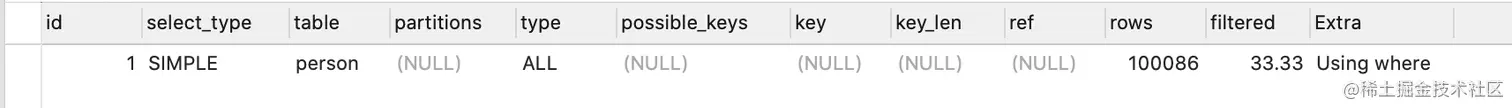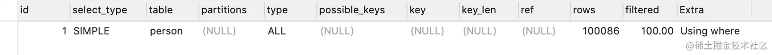 - 总行数是100086行(之前EXPLAIN时,也看到rows为100086)。你可能说,person表不是有10万行记录吗,为什么这里多了86行?其实,MySQL的统计信息是一个估算,其统计方式比较复杂我就不再展开了。但不妨碍我们根据这个值估算CPU成本,是100086*0.2=20017左右。