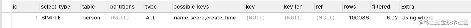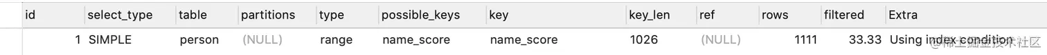 - key字段代表实际走的是哪个索引,其值是name_score,说明走的是name_score这个索引。