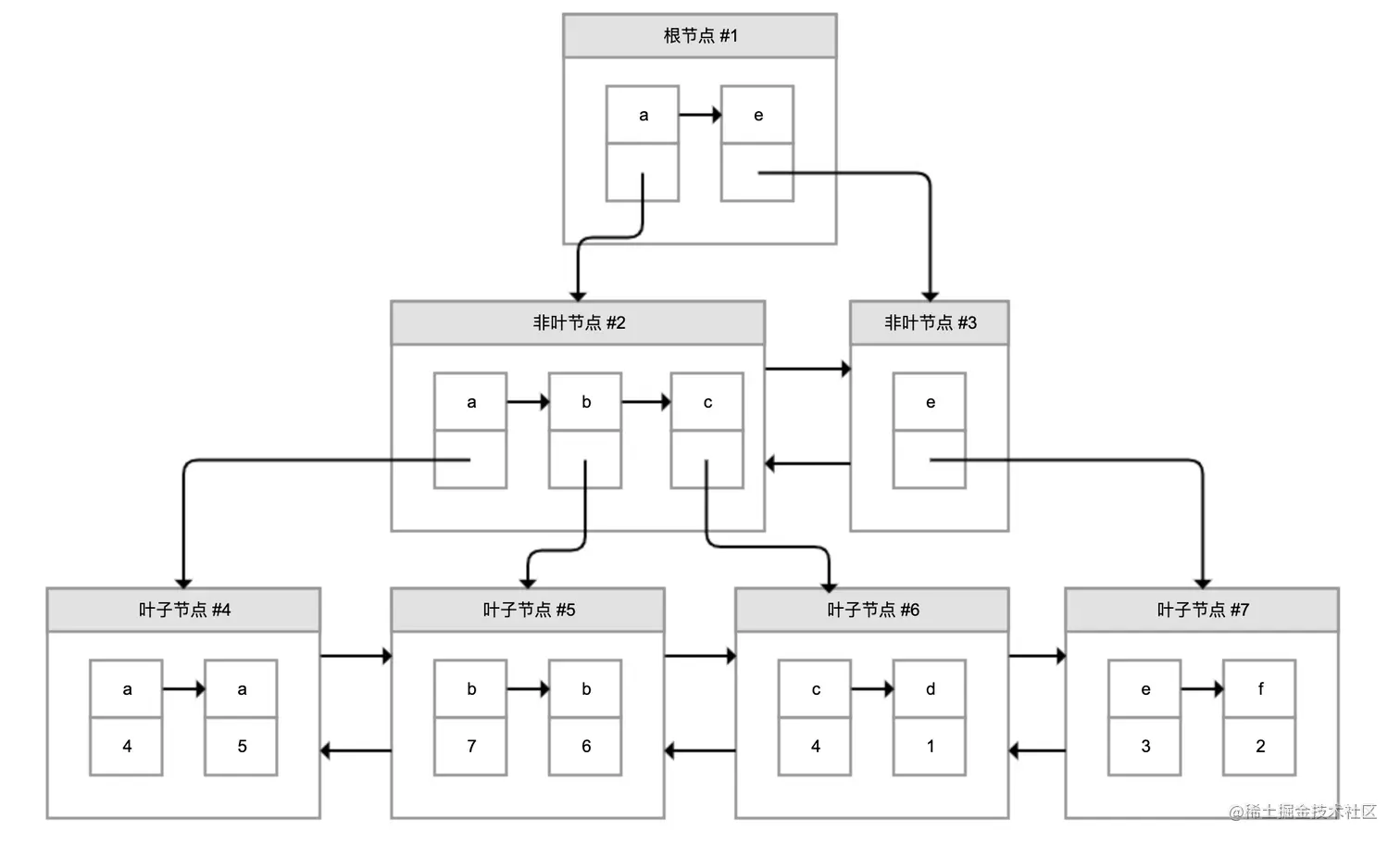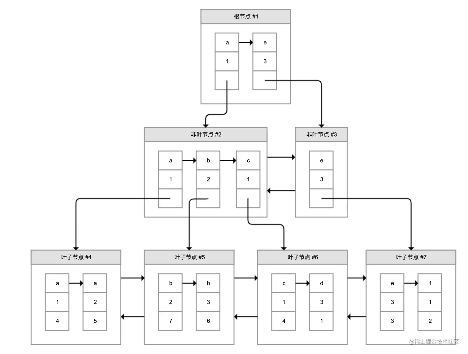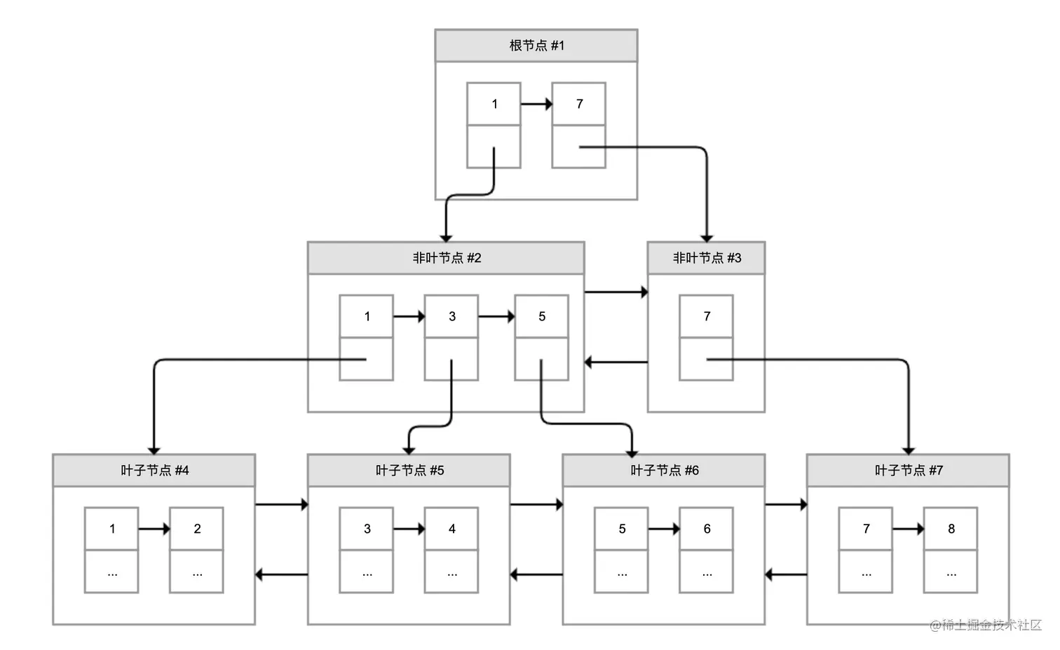 为了解决这个问题,InnoDB引入了B+树。如下图所示,B+树是一棵倒过来的树: