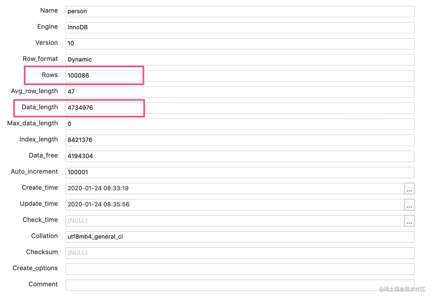 SHOW TABLE STATUS LIKE 'person'