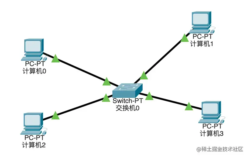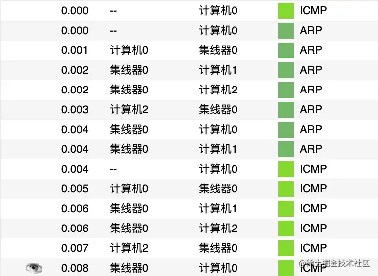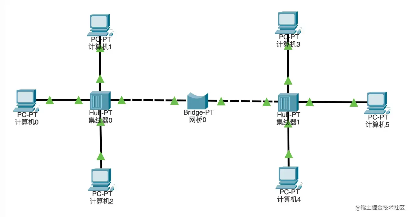 - 集线器0又把数据转送给了其他的连接设备(计算机0和计算机1),
