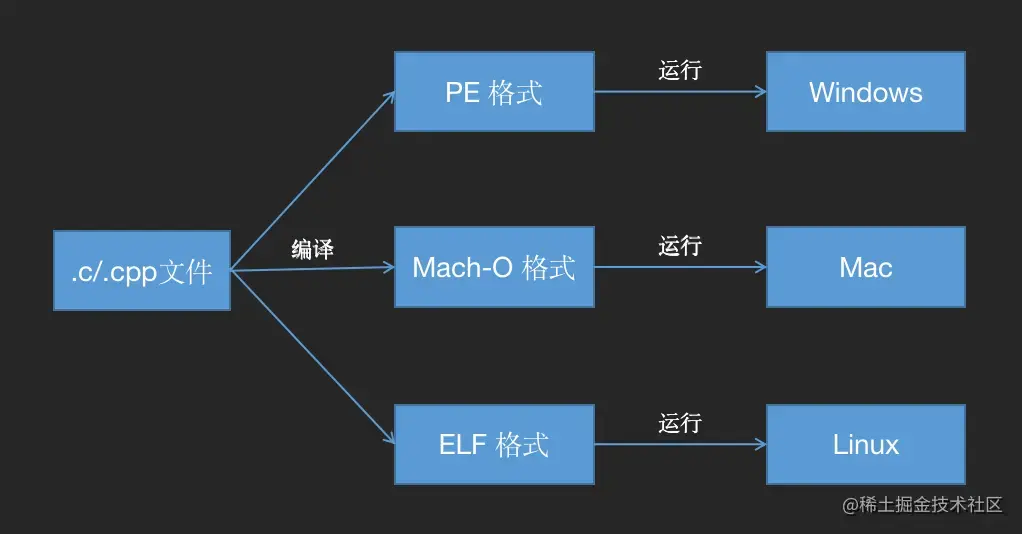 C/C++的跨平台:使用平台相关的编译器生成对应平台的可执行文件。