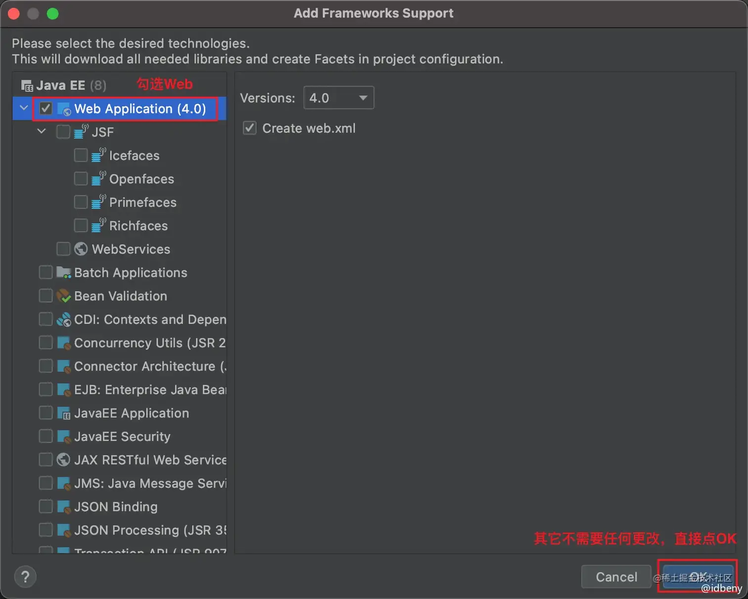 - 添加Web框架支持,完成后会在模块中出现一个web文件夹