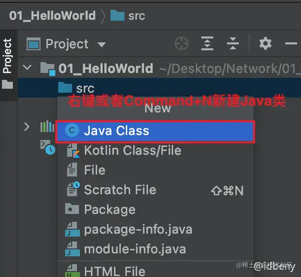 - 在刚刚创建的模块src下新建一个java类(src是存放模块代码的)