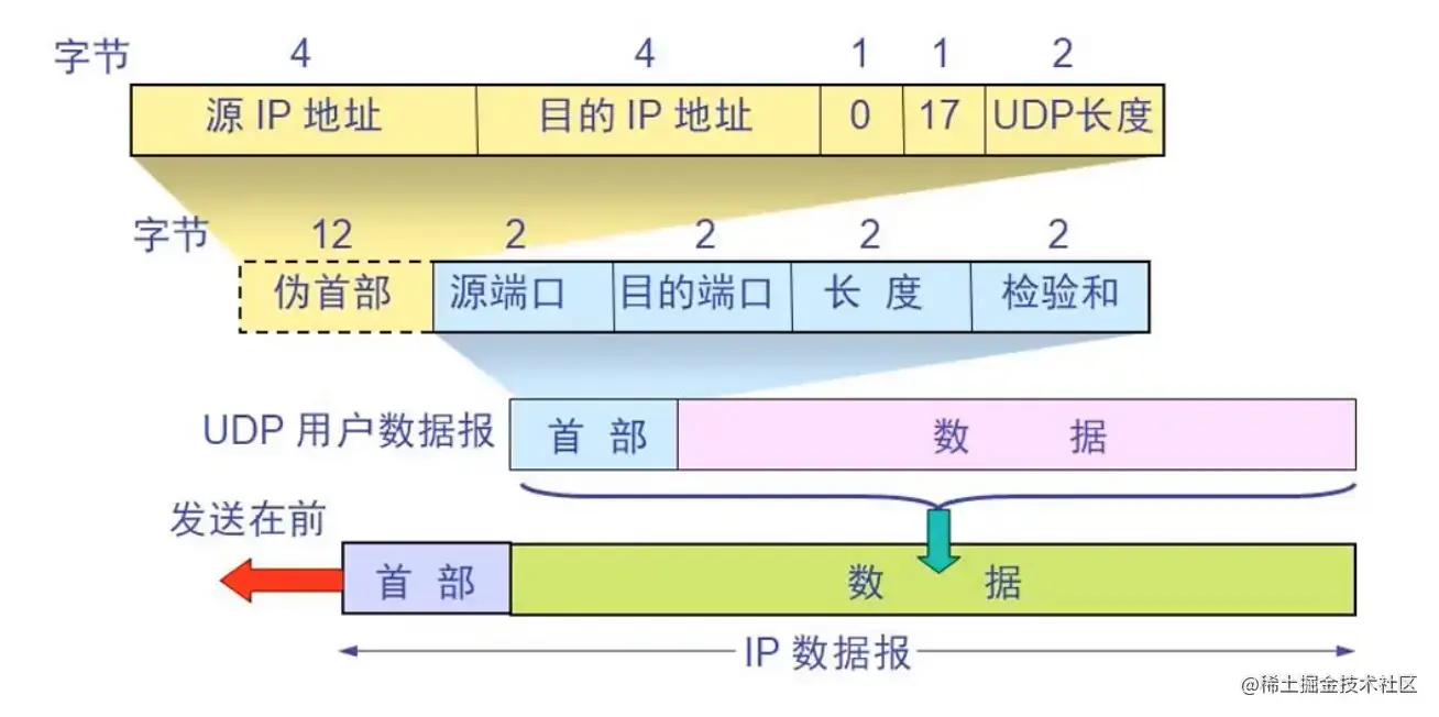 伪首部是固定的12字节,由源IP地址(4个字节) + 目的IP地址(4个字节) + 保留位(1个字节,默认是0) + 协议代表值(1个字节,UDP固定值17) + UDP长度(2个字节)组成。仅在计算检验和时起作用,并不会传递给网络层,目的是为了增强检验功能。
