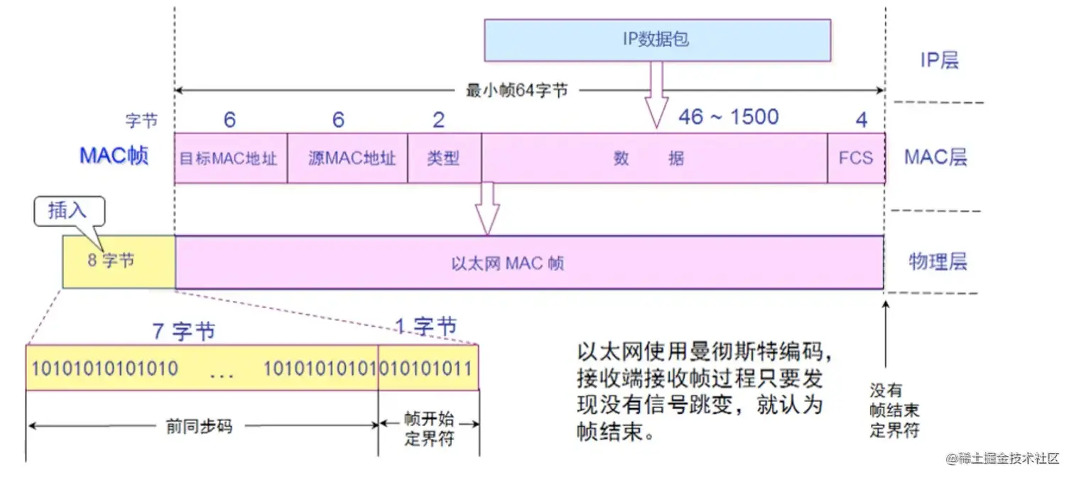 - 帧(Frame)的数据部分就是网络层传递下来的数据包(IP数据包,Packet)