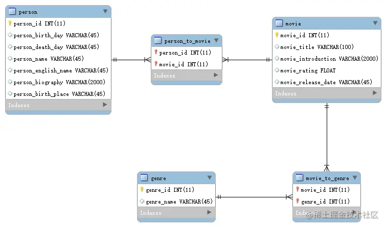 本实例数据获取方法:以周星驰为初始入口,获取其出演的所有电影;再获取这些电影的所有参演演员;最后获取所有参演演员所出演的全部电影。经过去重处理,我们得到了 505 个演员的基本信息和 4518 部电影的基本信息。数据保存在 mysql 中,其 ER 图如下: