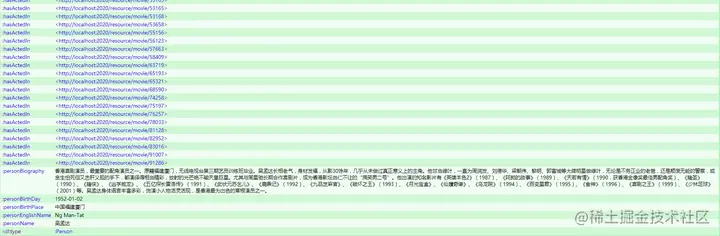 kg_demo_movie_mapping.ttl 是我们修改后的 mapping 文件。其支持导出的 RDF 格式有 “TURTLE”, “RDF/XML”, “RDF/XML-ABBREV”, “N3”, 和“N-TRIPLE”。“N-TRIPLE” 是默认的输出格式。