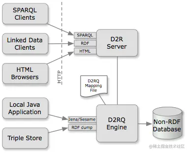 D2RQ,是以虚拟 RDF 的方式来访问关系数据库中的数据,即我们不需要显式地把数据转为 RDF 形式。通过默认,或者自己定义的 mapping 文件,我们可以用查询 RDF 数据的方式来查询关系数据库中的数据。换个说法,D2RQ 把 SPARQL 查询,按照 mapping 文件,翻译成 SQL 语句完成最终的查询,然后把结果返回给用户。下面是 D2R Server 的架构图: