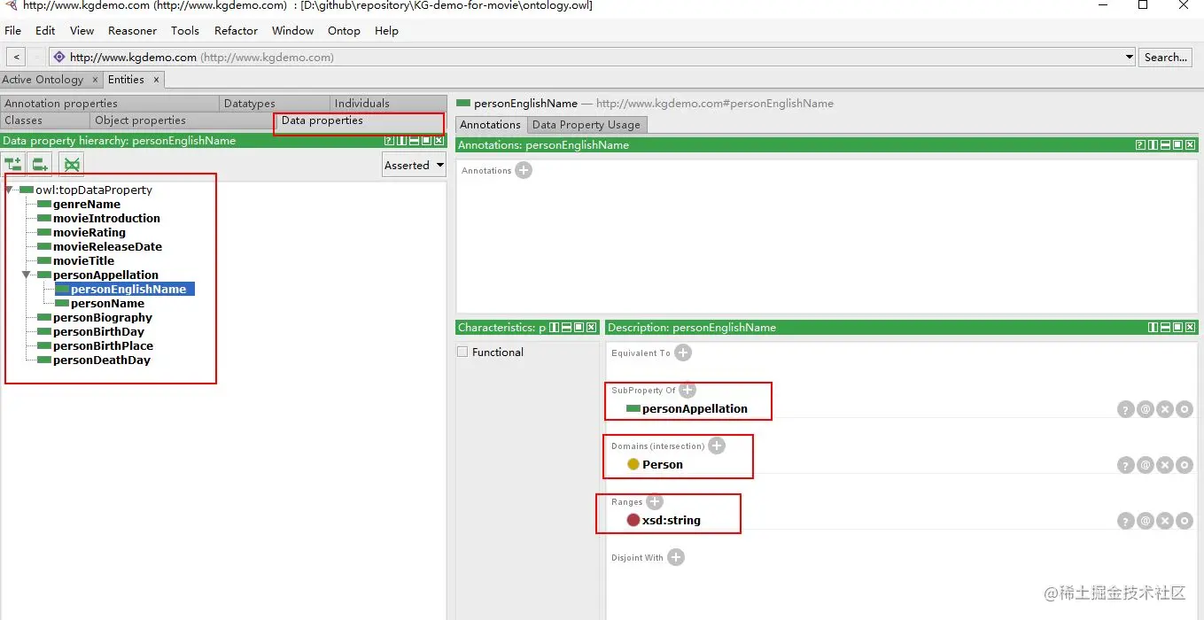 最后,我们切换到 "Data properties",我们在该界面创建类的属性,即,数据属性。其定义方法和对象属性类似,除了没有这么丰富的描述属性特性的词汇。其实不难理解,这些描述特性的词汇是传递、对称、反对称、自反等,表明其必定有指向其他资源或自身的边,而我们之前提到过,数据属性相当于树的叶子节点,只有入度,而没有出度。