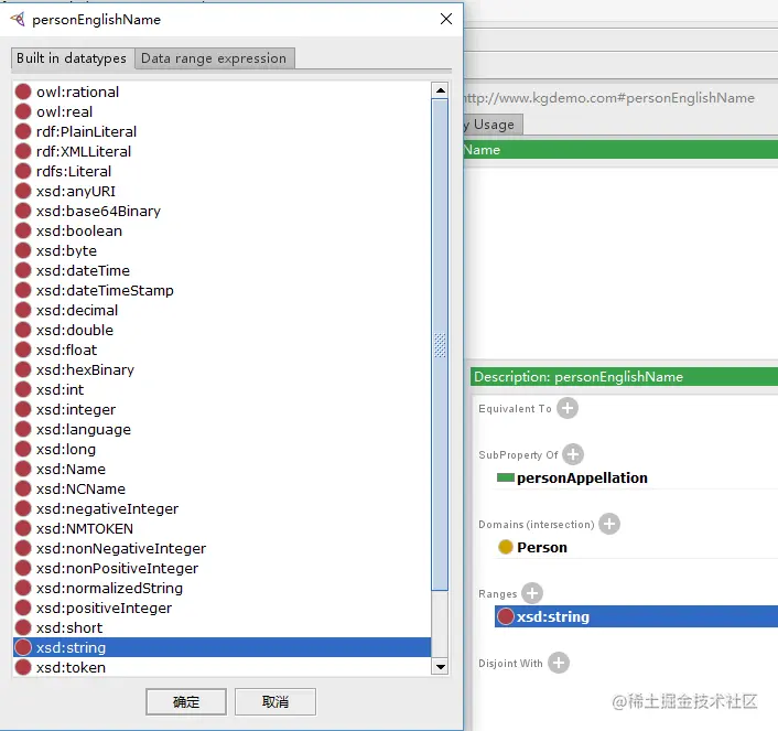 其实区分数据属性和对象属性还有一个很直观的方法,我们观察其 "range",取值范围即可。对象属性的取值范围是类,而数据属性的取值范围则是字面量,如下图。