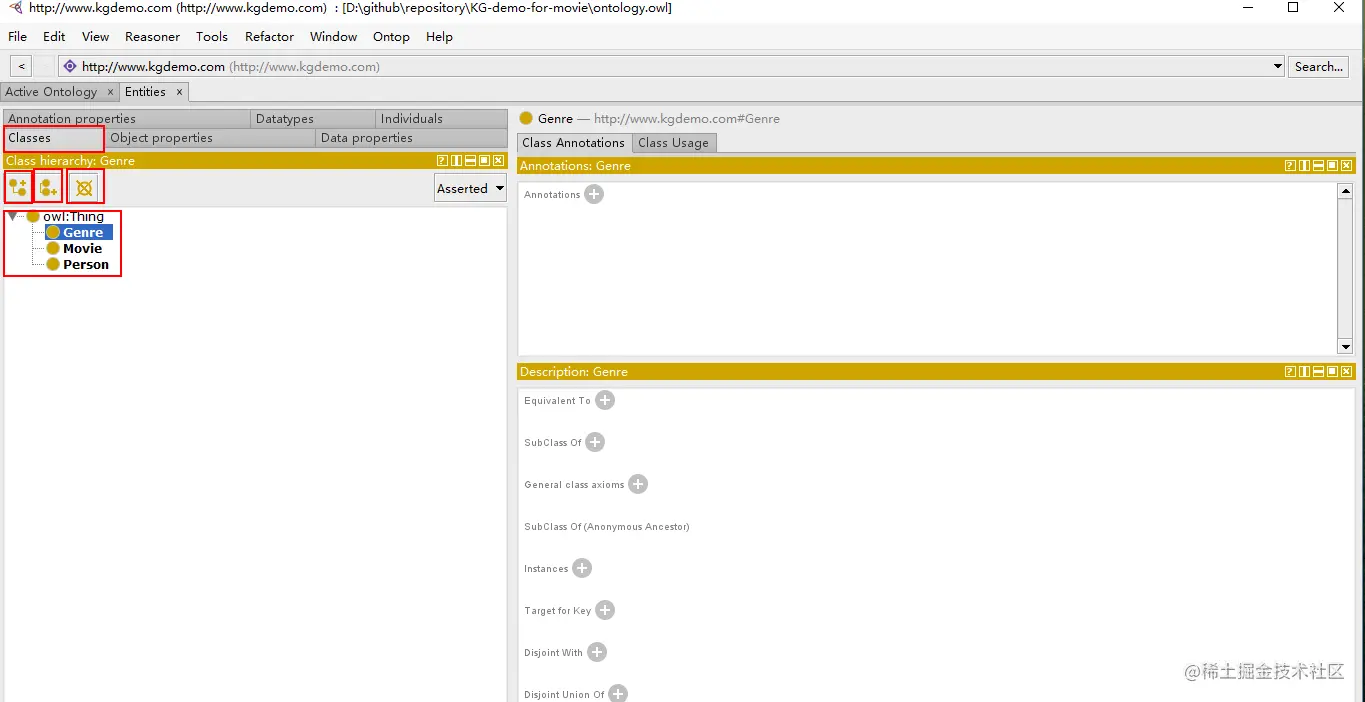 点击 “Entities”tab 标签,选择“Classes” 标签。在这个界面,我们创建电影知识图谱的类 / 概念。注意,所有的类都是 “Thing” 的子类。最左边红色小方框中的按钮用于创建当前选中类的子类,中间的按钮用于创建兄弟类(平行类),最右边的按钮删除当前选中的类。我们创建了三个类,“人物”、“电影”、“类别”。右下方的界面是用于描述该类的一些特性,例如:"disjoint of" 是用于表示该类与哪些类是互斥的。本例中,三个类都是互斥的。也就是说,一个实例只能是三个类中的一个。我们没有在 protege 中显式地定义互斥关系,读者可以自己定义。