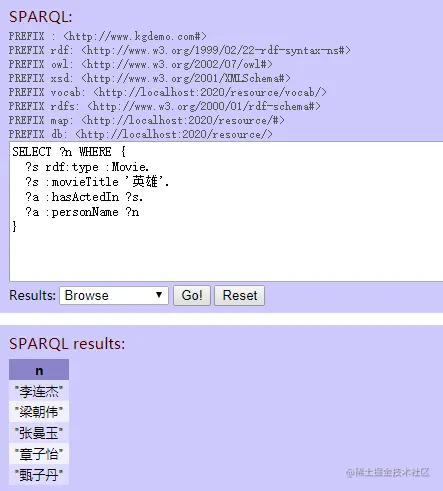 输入框默认的 SPARQL 查询是获取所有的 RDF 三元组,“LIMIT” 关键词指定返回结果数量的上限。点击下图红框中的 “Go!”,执行查询:
