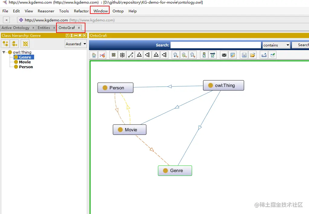 protege 也支持以可视化的方式来展示本体结构。我们点击 "Window" 选项,在 "Tabs" 中选择 "OntoGraf",然后 "Entities" 旁边就多了一个标签页。在右侧窗口中移动元素,可以很直观地观察本体之间的关系。