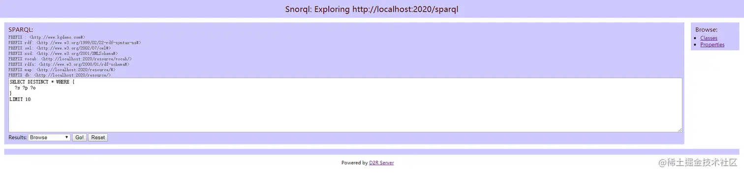 “kg_demo_movie_mapping.ttl” 是我们定义的 mapping 文件。其他参数和配置请参考官方文档。默认端口是 2020,在浏览器输入 “http://localhost:2020/”,可以看到如下界面: